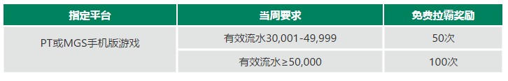 | PT或MGS手机版游戏 | 有效流水30,001-49,999 | 50次 |